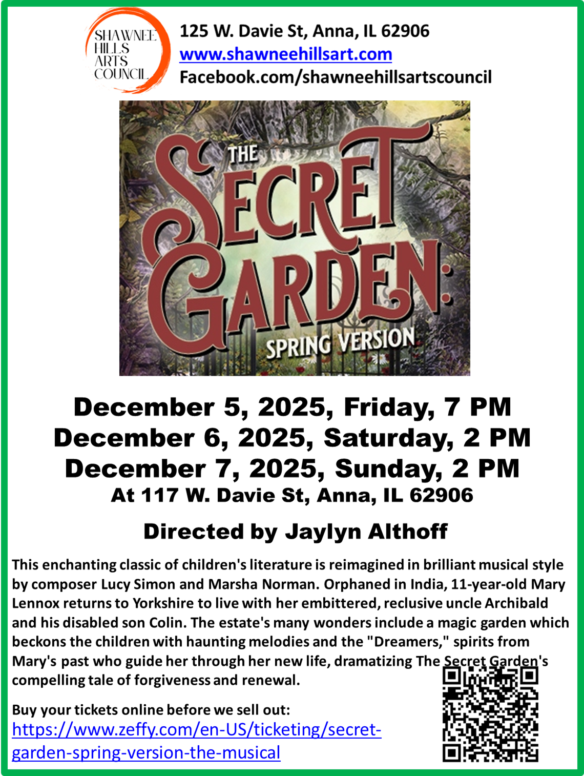 Tickets can be purchased online before we sell out at https://www.zeffy.com/en-US/ticketing/secret-garden-spring-version-the-musical.